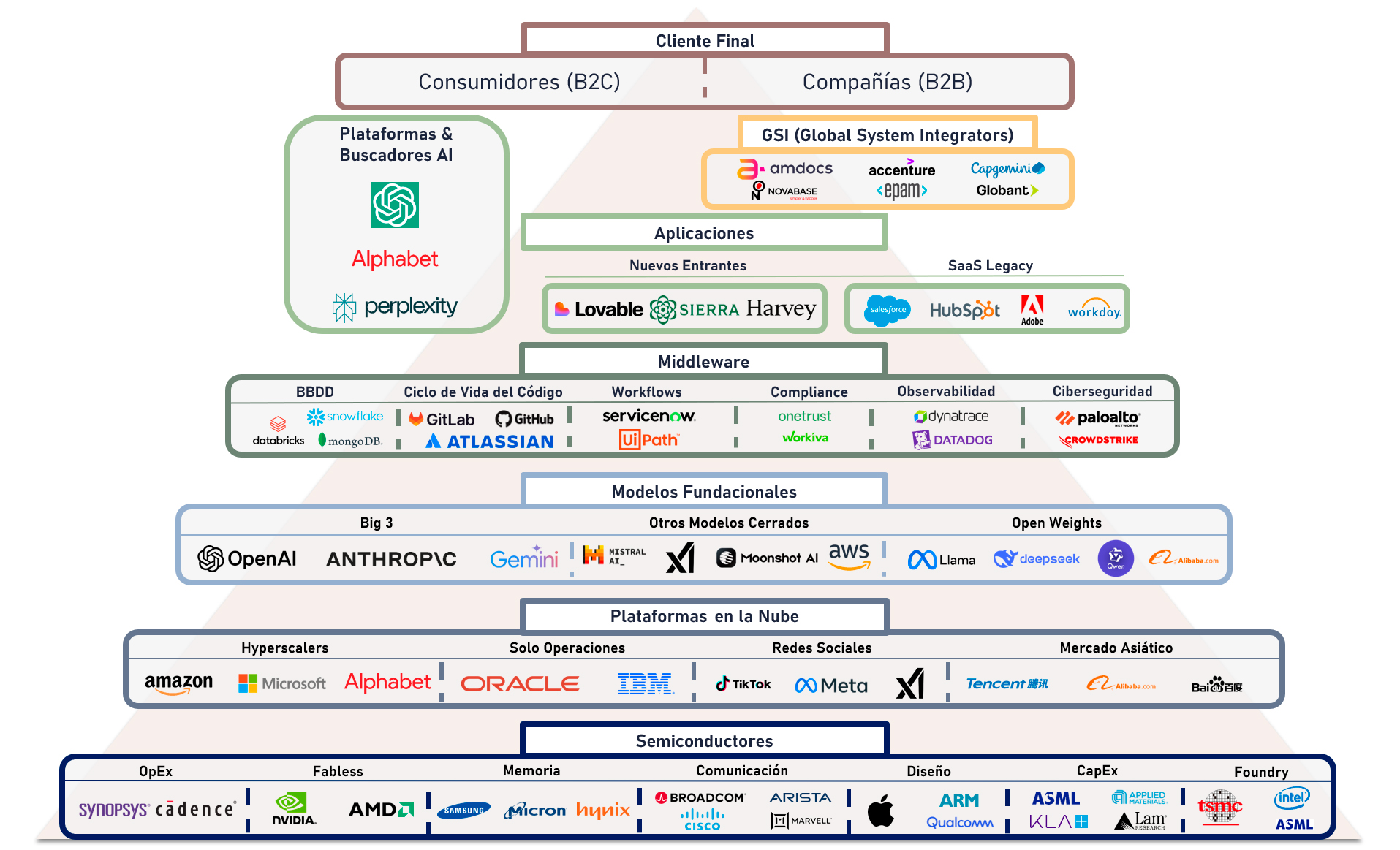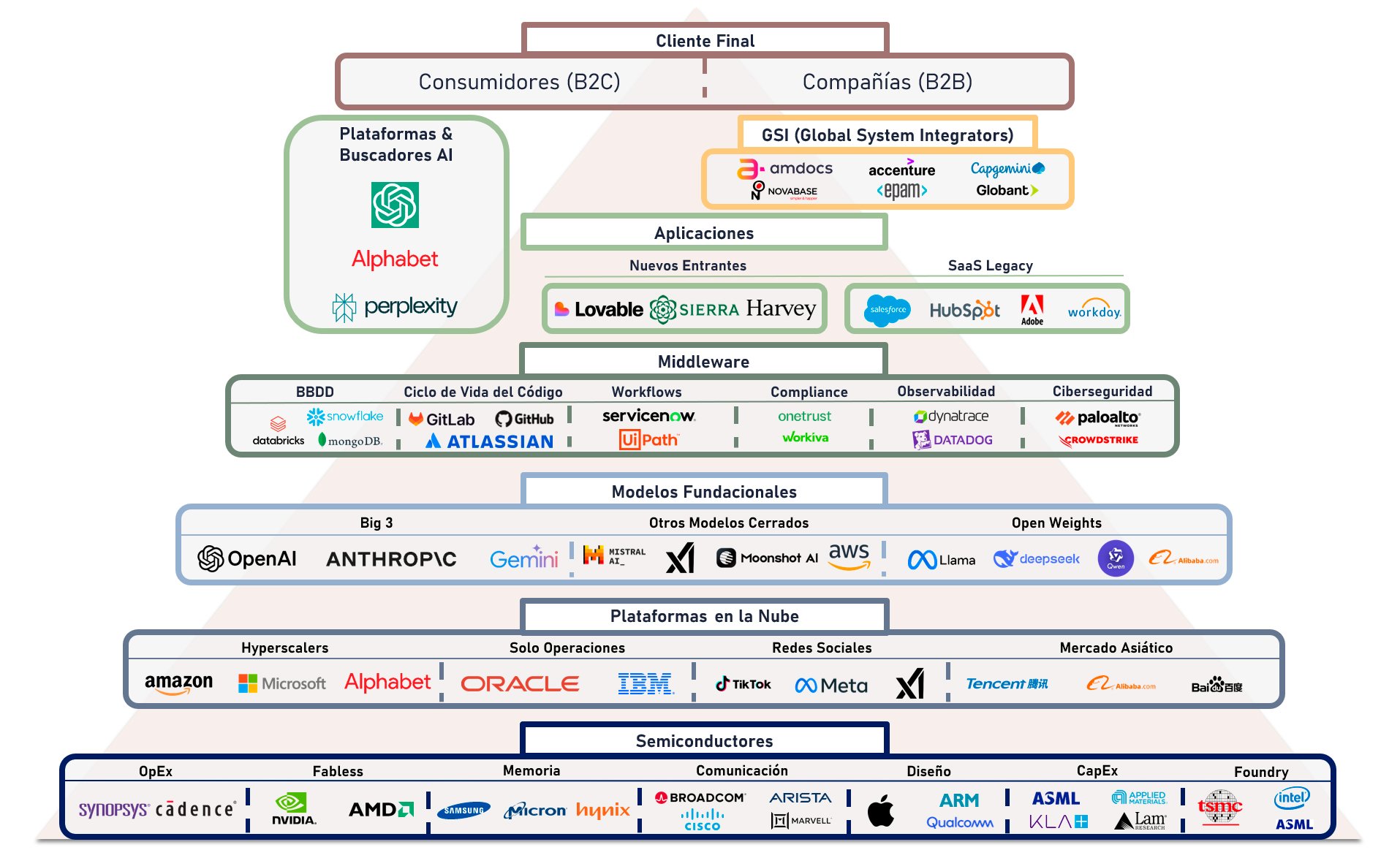 Lo que no permiten una cobertura integral de todas las capas del stack tecnológico y de la interacción entre ellas. Gracias a ello, podemos seleccionar los líderes consolidados y los ganadores emergentes en los nichos con mejores perspectivas de crecimiento gracias a las oportunidades que surgen tanto de tendencias propias de cada cluster, como, de manera transversal, con la disrupción provocada por la Inteligencia Artificial.